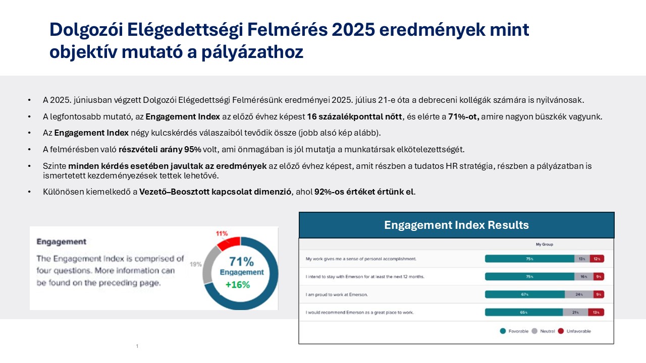 A program célja az elköteleződés erősítése és az Emerson vállalati identitásának tudatos építése volt. A 2025-ös pénzügyi évre kitűzött mérőszám az elkötelezettségi index 54,5%-ról 65%-ra történő emelése volt. További célunk az értékek gyakorlati alkalmazásának elősegítése volt. Kiemelt fókusz volt a vezetők és munkavállalók közötti kapcsolat erősítése, valamint az NI és Emerson közötti szinergiák bemutatása.